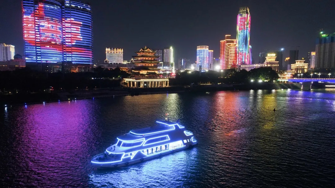 微風(fēng)拂面,夜景怡人,滿載游客的3艘邕江游船來(lái)回穿梭在邕江之上,沿江兩岸燈光絢麗多彩,跨江大橋恢弘大氣,民樂(lè)表演風(fēng)情十足,乘船游客紛紛拿出手機(jī)、相機(jī)合影留念。
